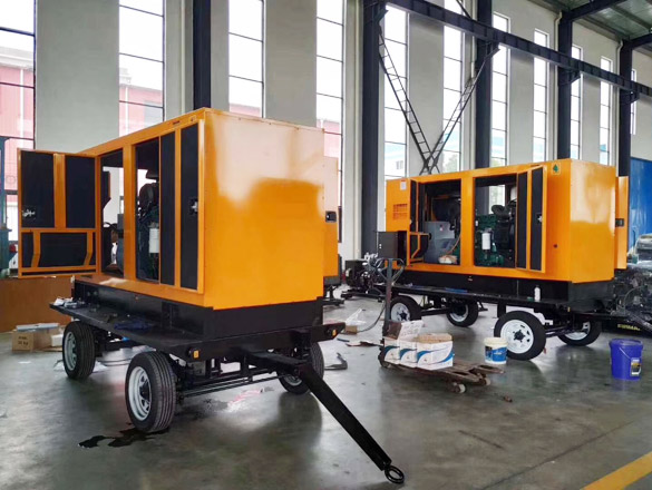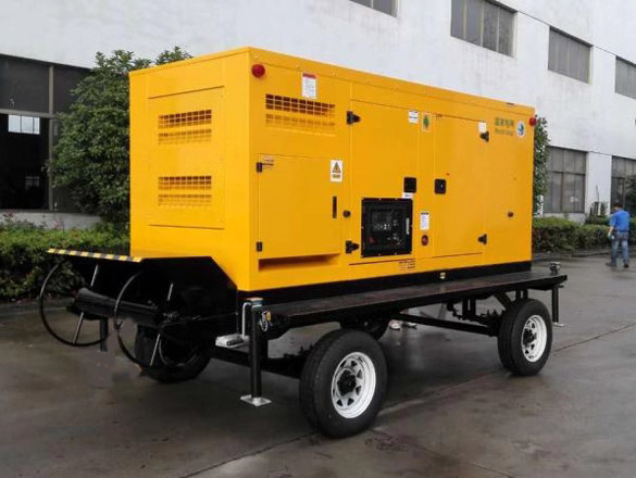 拖车车架采用槽梁焊接成框架结构,节点选择合理、强度高、刚性好;同时装有钢板弹簧悬架结构;拖车采用高度可调节插销式牵引架,适用于各种高度牵引车;采用圆形钢管焊接直通式车轴,结构紧凑,安全可靠;车架四角设有机械式支撑装置,配备惯性行车制动、驻车制动和脱离应急制动,确保机组在各种状况下的安全;车架前端设有支撑轮,具备承受机组垂直载荷的功能的同时还具备导向功能;整车配备转向和刹车指示灯,同时装有尾灯标准插头。
